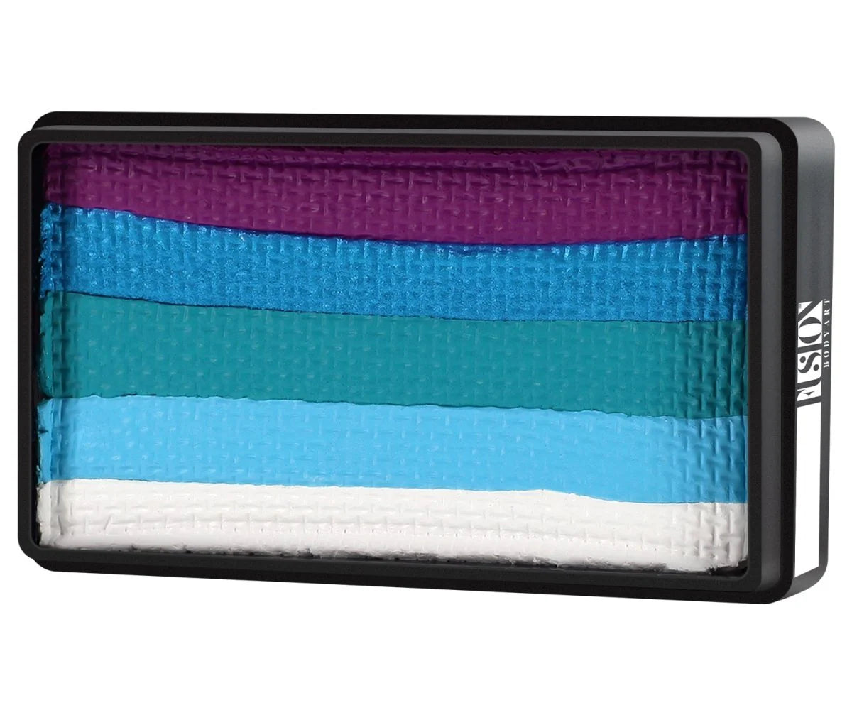 Fusion Body Art’s split cakes just require a flat face painting brush and water to get started. For flowing cheek art designs, use a 1” flat brush to load all of the colours in the split cake or use smaller flat brushes to just pick up a few of the colours. Make sure to start with a slightly damp brush and add more water as needed by just dipping one corner of the brush lightly into your water. If you are new to 1 stroke face painting, the internet is filled with tons of amazing 1 stroke design ideas to inspire you.