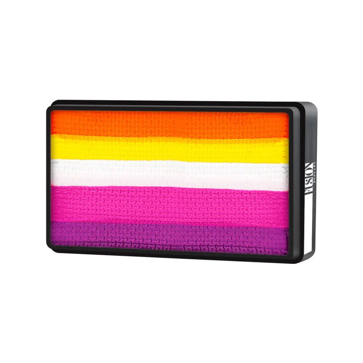 Fusion Body Art’s split cakes require a flat face painting brush and water to start. For flowing cheek art designs, use a 1” flat brush to load all of the colours in the split cake or use smaller flat brushes to just pick up a few of the colours. Make sure to start with a slightly damp brush and add more water as needed by just dipping one corner of the brush lightly into your water. If you are new to 1 stroke face painting, the internet is filled with tons of amazing 1 stroke design ideas to inspire you.