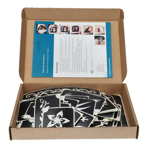 The Superstar BIG Festival XXL Glitter Tattoo Stencils are the ideal stencils to easily create a cool glitter tattoo. A glitter tattoo is a temporary tattoo and will last for 3-7 days when used with Superstar Body Glue (art. no. 139-92.1). Guaranteed success with young and old!