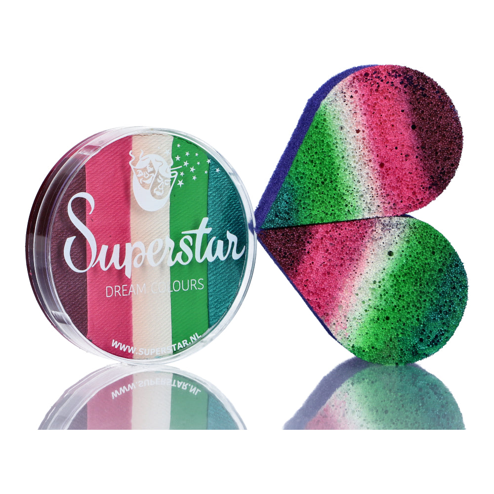 Superstar Dream colours are made of a very user-friendly, high-quality water make-up that meets all the strict requirements of the European Cosmetics Legislation (1223/2009 / EC). The colours are nice and clear, the make-up works nicely and is easy to remove. A thin layer of Superstar make-up is sufficient to create a nice covering base. The make-up dries quickly and does not stain. Cracking of the paint surface is normal and will not affect the performance of the Superstar Aqua Face- and Bodypaint. The overflowing or mixing of colours in the jar is normal and has no effect on the final result.